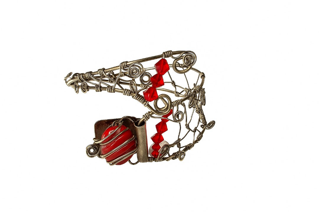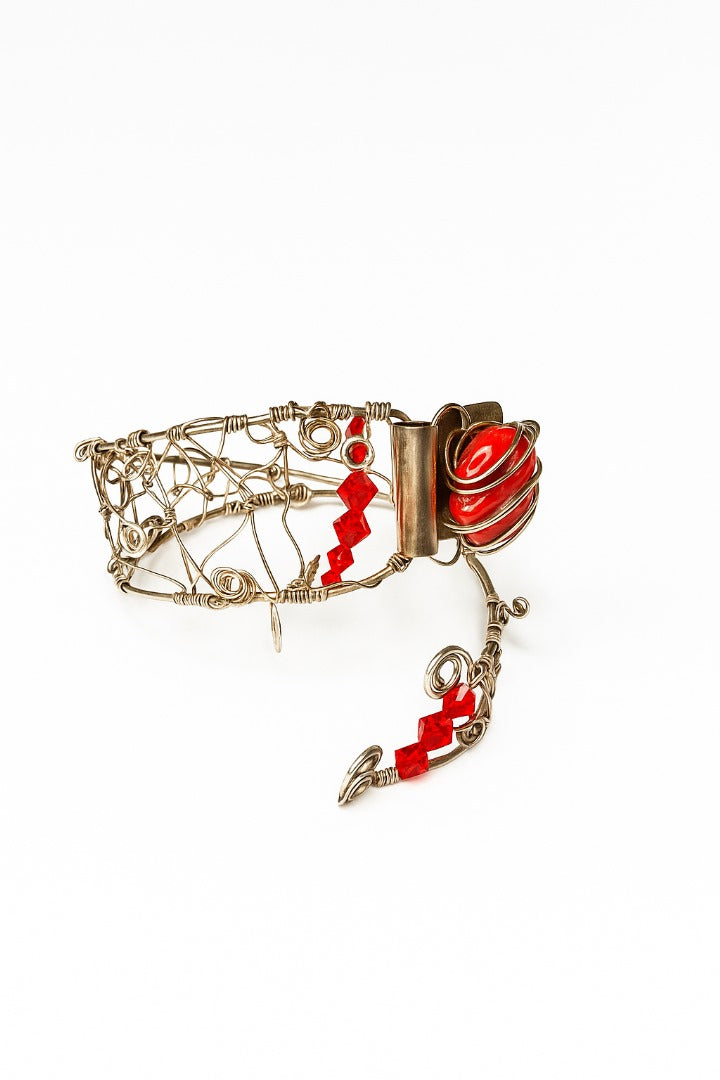 Turn heads and spark conversations with this bold yet sophisticated piece. Featuring vibrant Red Coral gemstones, dazzling Swarovski crystals, and wrapped in genuine sterling silver, this accessory radiates warmth, power, and timeless elegance.